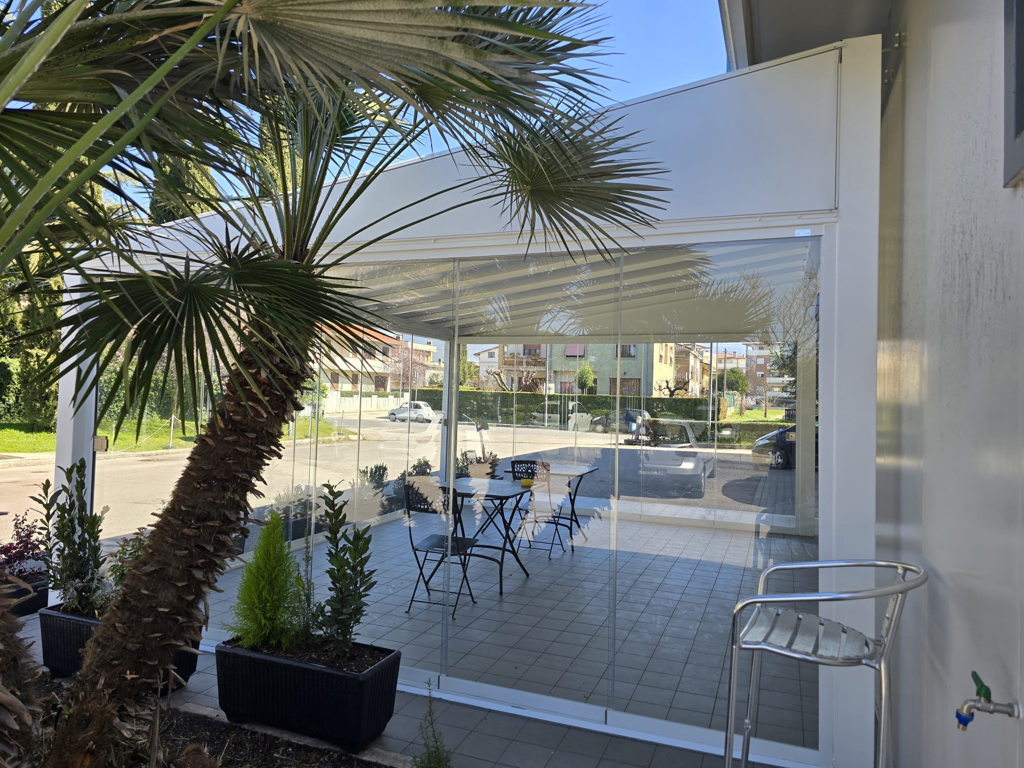 Una superficie completamente trasparente che protegge da vento, pioggia e freddo mantenendo una vista aperta verso l’esterno.